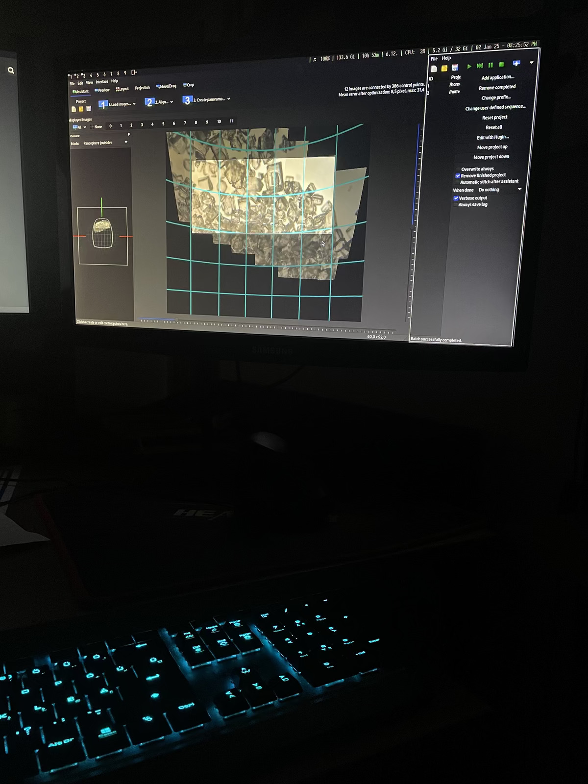 Above can be seen Hugin, and how it stitches many pictures together. It's main purpose, I think, is to create panorama pictures. It glues the images on a sphere, and produces the final image from there.