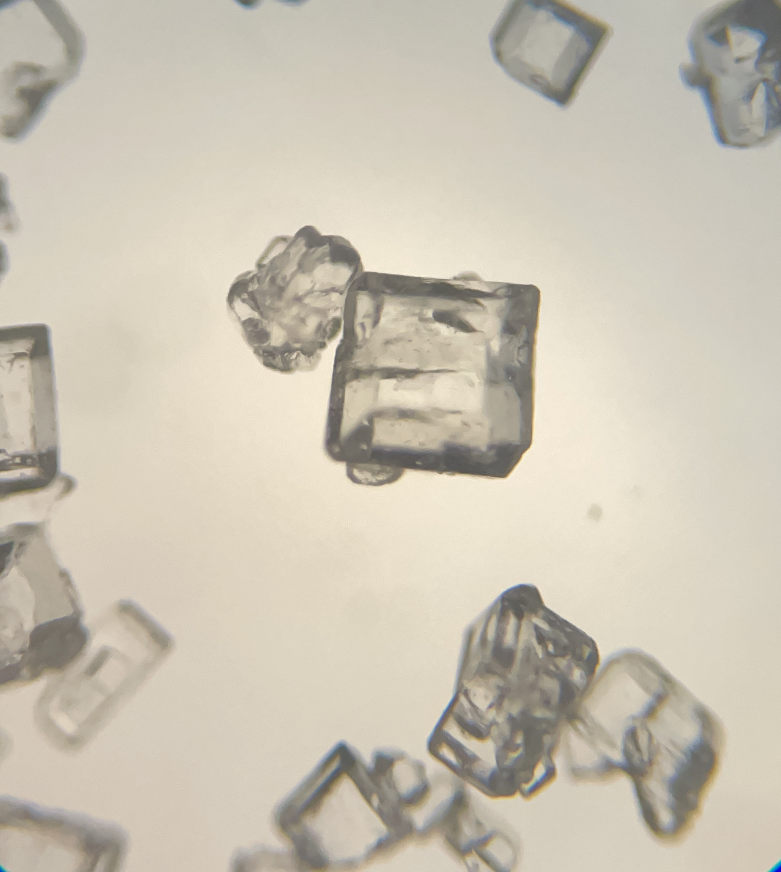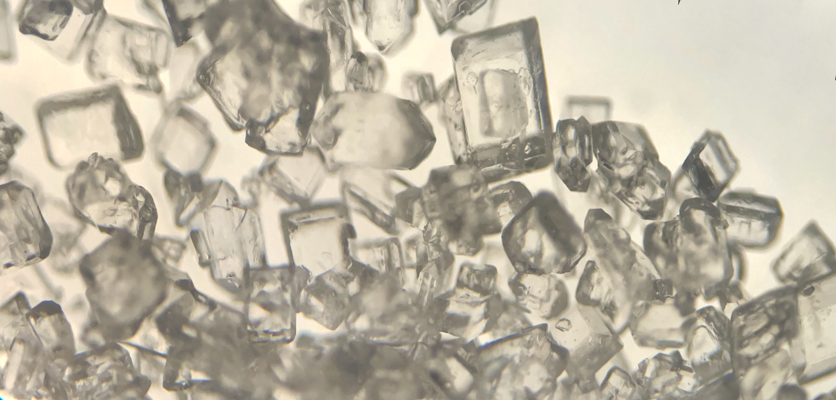 If we look closely at a sugar under a microscope, we could be quick to say that sugar crystals look like cubes - which is true - but they aren't exactly cubes. They have oblong and slanted ends.