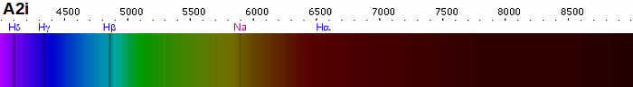 The surface temperatures of A-type stars are between 7,900--10,000 K, and their color is white. Their spectrum shows strong hydrogen Balmer lines (strongest at the A0 type) and ionized metal lines: Fe II, Mg II, Si II (strongest at the A5 type). Helium and calcium lines are weaker. About 0.63% of main sequence stars fall into this class, such as Vega, Deneb, and Sirius.