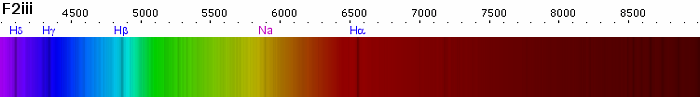 Their surface temperatures are between 6,000 and 7,500 K. In their spectra, alongside weak (weakening from F0 to F9) hydrogen lines, we can see the singly ionized Fe and Cr metal lines (strengthening from F0 to F9). About 3.1% of main sequence stars belong to this class -- examples include Canopus and Procyon.