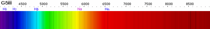 Their surface temperatures are 5,000--6,000 K. We know the most about this spectral class because our Sun belongs here. The neutral hydrogen lines weaken, and the neutral metal lines become the strongest. The singly ionized calcium H and K lines are also visible. The G-band is extremely strong (actually a group of CH and Fe lines). About 8% of main sequence stars belong here; besides the Sun, examples include τ Ceti and Capella. The spectrum of a G5 III spectral type star is shown in the figure below