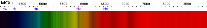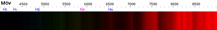 This group corresponds to Class III in the Secchi system. Their surface temperatures are between 2,200--3,500 K. Their spectra show absorption molecular bands (CN, CH, CO, TiO, VO, MgH, and H₂) and neutral metal lines. More than 78% of main sequence stars are classified in this class -- such stars include Betelgeuse (giant star), Barnard's Star (dwarf), Gliese 581 (red dwarf), LEHPM 2-59 (subdwarf), and GSC 08047-00232 B, a late M-type brown dwarf.